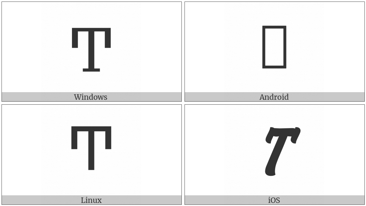 The image below shows how the “Greek Capital Letter Archaic Sampi” symbol might look like on different operating systems. If the font in which this web site is displayed does not contain the symbol and there is no fallback font able to render it, you can use the image below to get an idea of what it should look like.