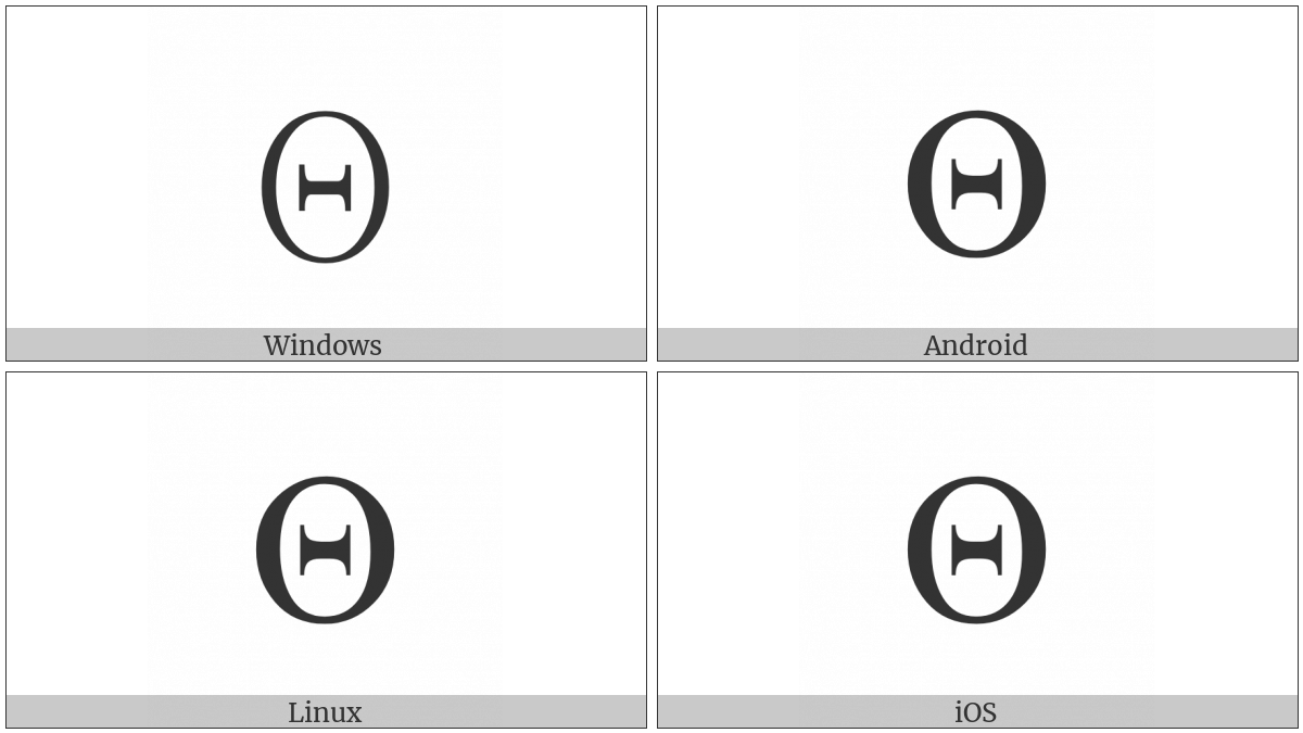 The image below shows how the “Greek Capital Letter Theta” symbol might look like on different operating systems. If the font in which this web site is displayed does not contain the symbol and there is no fallback font able to render it, you can use the image below to get an idea of what it should look like.
