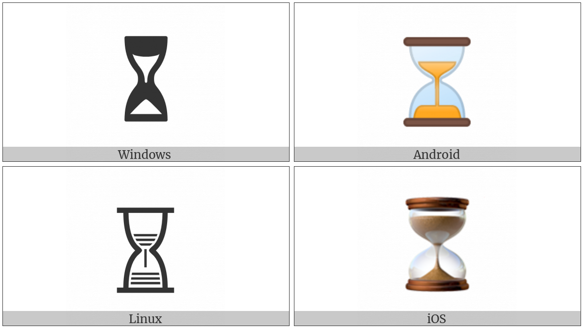 The image below shows how the “Hourglass With Flowing Sand” symbol might look like on different operating systems. If the font in which this web site is displayed does not contain the symbol and there is no fallback font able to render it, you can use the image below to get an idea of what it should look like.