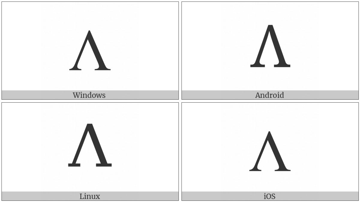 The image below shows how the “Greek Capital Letter Lamda” symbol might look like on different operating systems. If the font in which this web site is displayed does not contain the symbol and there is no fallback font able to render it, you can use the image below to get an idea of what it should look like.