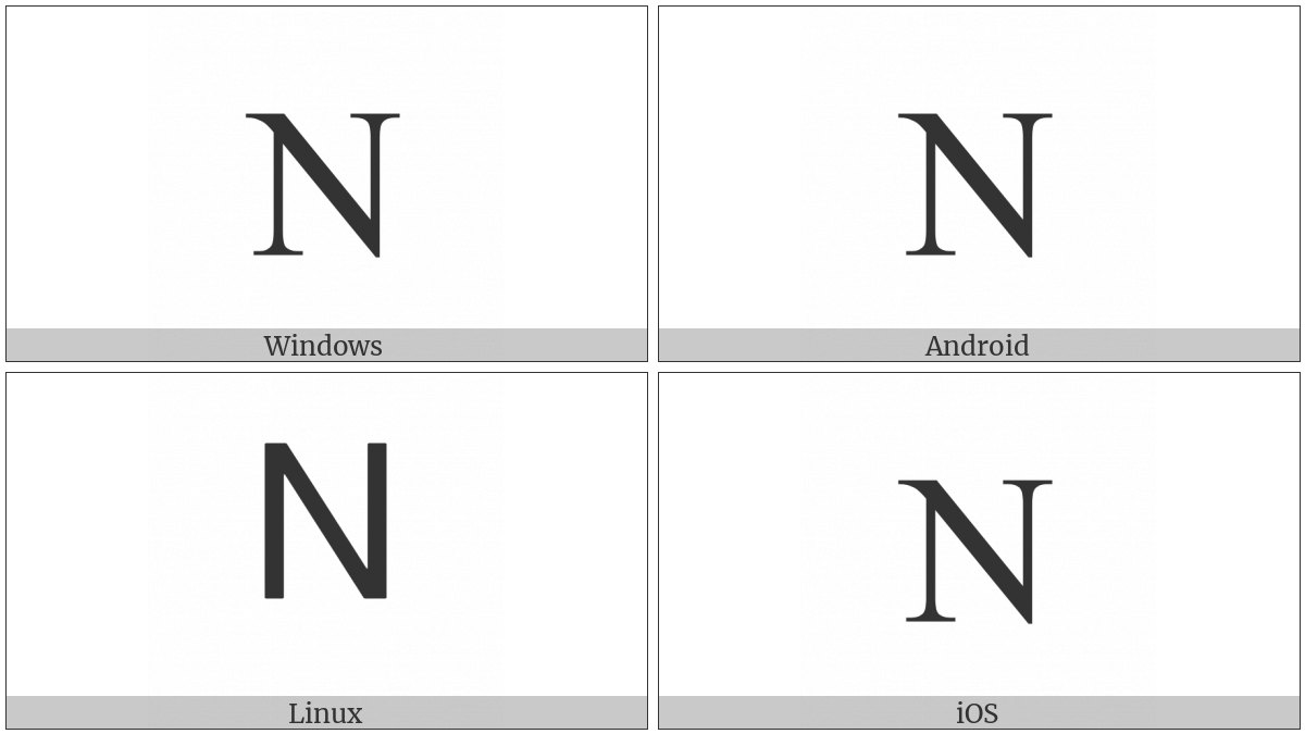 The image below shows how the “Greek Capital Letter Nu” symbol might look like on different operating systems. If the font in which this web site is displayed does not contain the symbol and there is no fallback font able to render it, you can use the image below to get an idea of what it should look like.