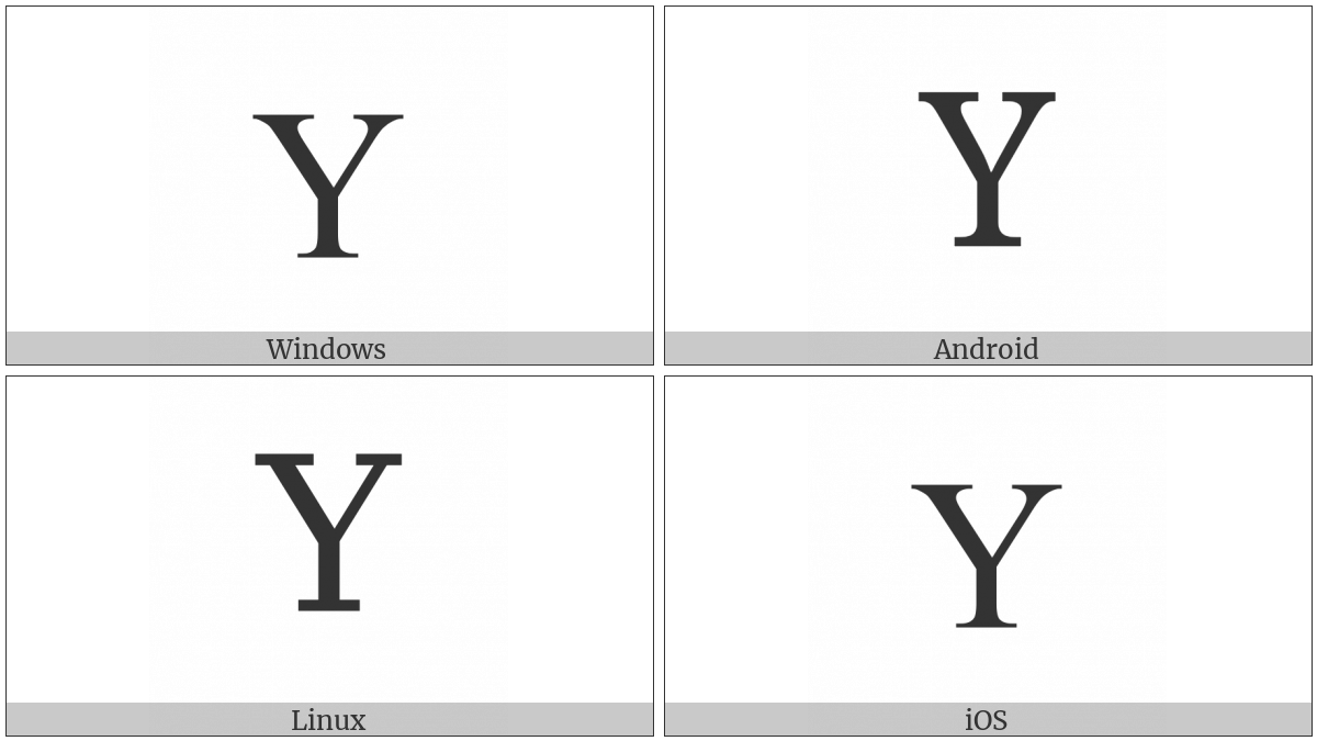 The image below shows how the “Greek Capital Letter Upsilon” symbol might look like on different operating systems. If the font in which this web site is displayed does not contain the symbol and there is no fallback font able to render it, you can use the image below to get an idea of what it should look like.