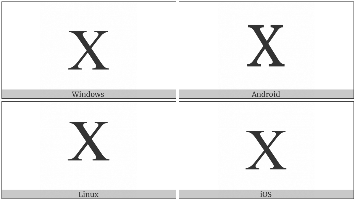 The image below shows how the “Greek Capital Letter Chi” symbol might look like on different operating systems. If the font in which this web site is displayed does not contain the symbol and there is no fallback font able to render it, you can use the image below to get an idea of what it should look like.