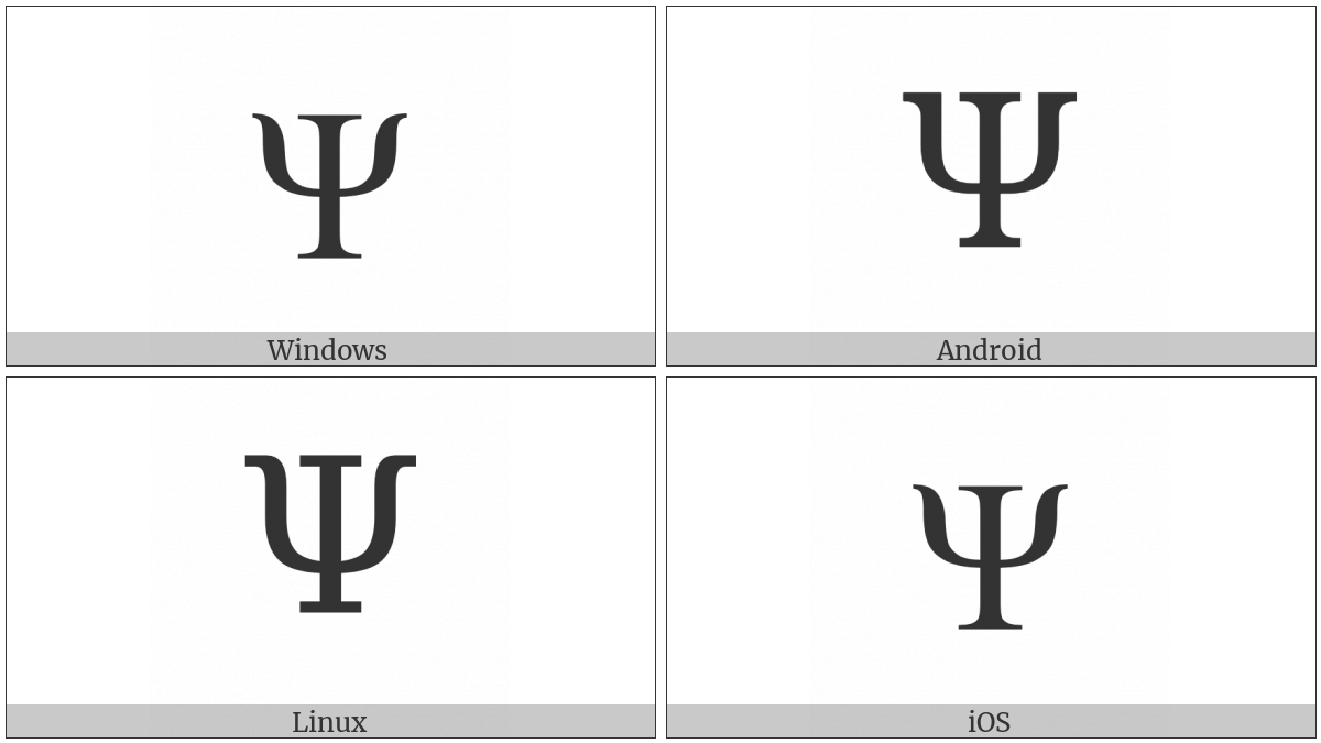 The image below shows how the “Greek Capital Letter Psi” symbol might look like on different operating systems. If the font in which this web site is displayed does not contain the symbol and there is no fallback font able to render it, you can use the image below to get an idea of what it should look like.