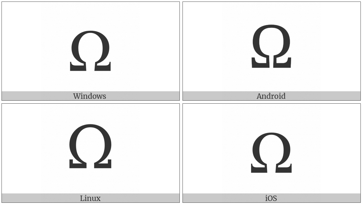 The image below shows how the “Greek Capital Letter Omega” symbol might look like on different operating systems. If the font in which this web site is displayed does not contain the symbol and there is no fallback font able to render it, you can use the image below to get an idea of what it should look like.