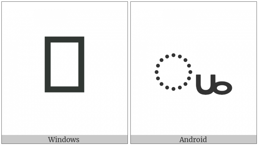 The image below shows how the “Miao Vowel Sign Ung” symbol might look like on different operating systems. If the font in which this web site is displayed does not contain the symbol and there is no fallback font able to render it, you can use the image below to get an idea of what it should look like.