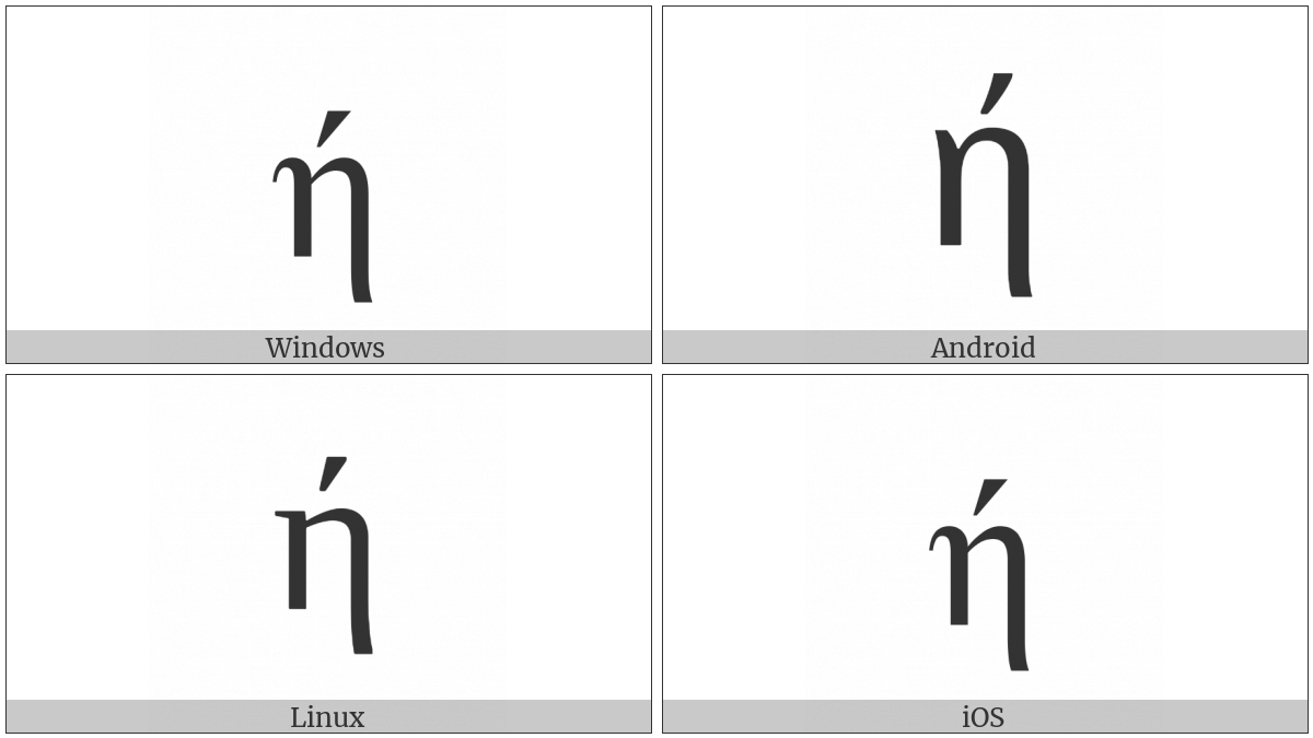 The image below shows how the “Greek Small Letter Eta With Tonos” symbol might look like on different operating systems. If the font in which this web site is displayed does not contain the symbol and there is no fallback font able to render it, you can use the image below to get an idea of what it should look like.