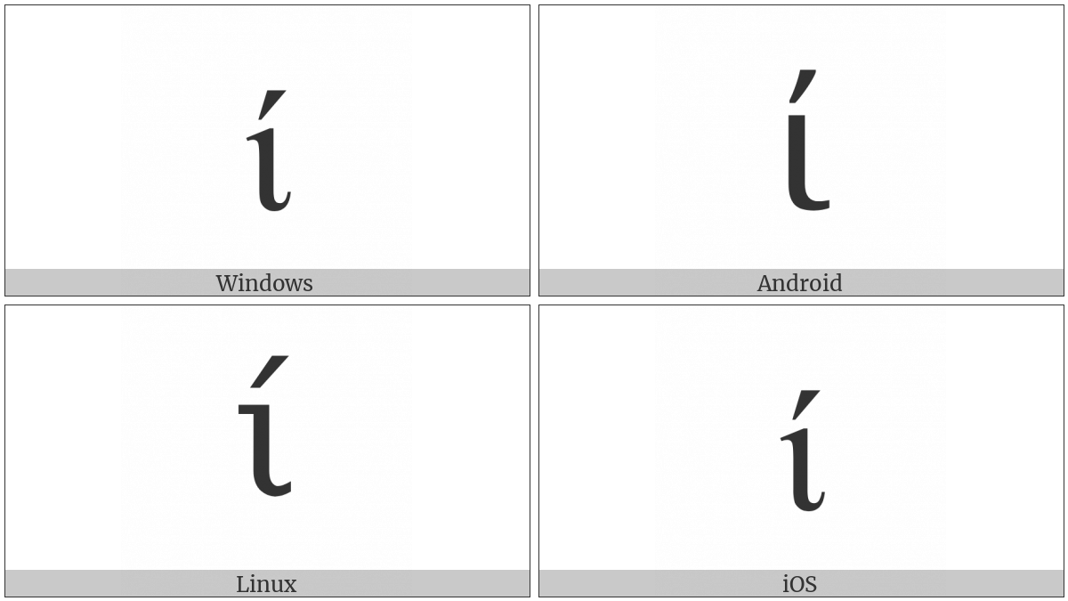 The image below shows how the “Greek Small Letter Iota With Tonos” symbol might look like on different operating systems. If the font in which this web site is displayed does not contain the symbol and there is no fallback font able to render it, you can use the image below to get an idea of what it should look like.