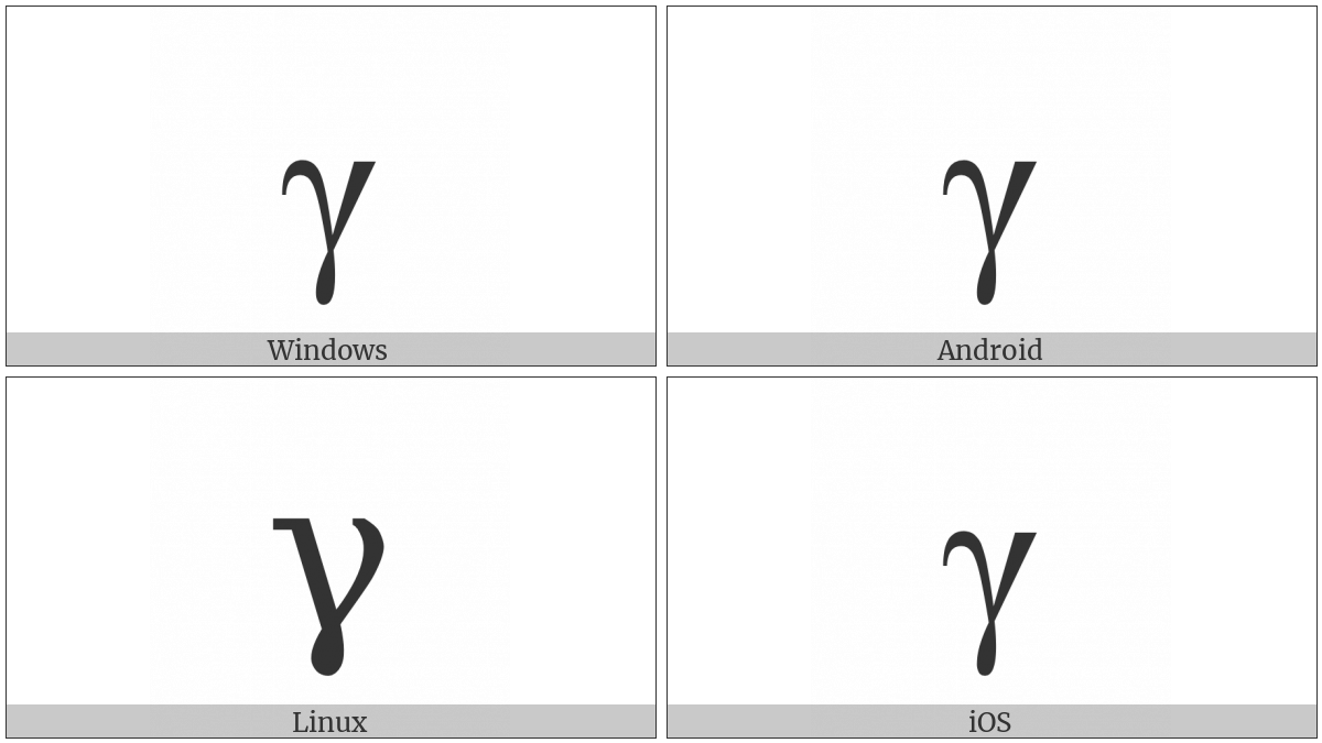 The image below shows how the “Greek Small Letter Gamma” symbol might look like on different operating systems. If the font in which this web site is displayed does not contain the symbol and there is no fallback font able to render it, you can use the image below to get an idea of what it should look like.