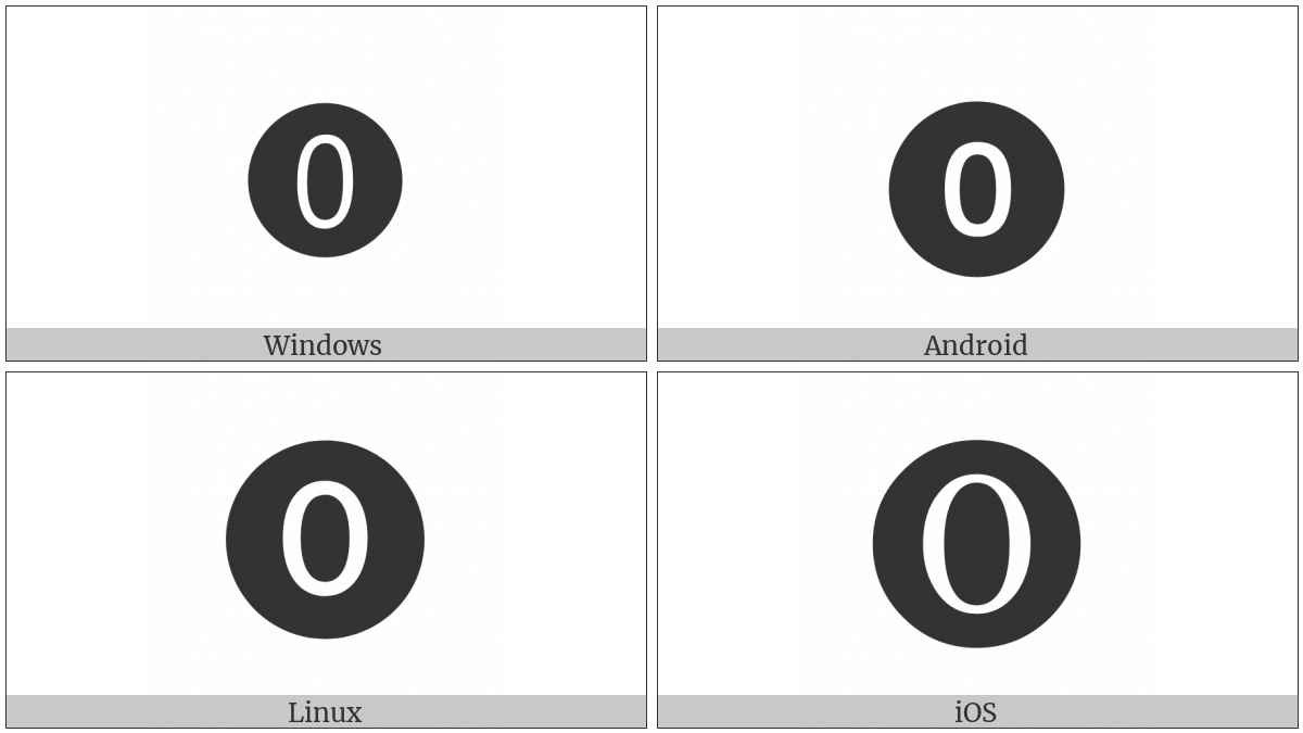 The image below shows how the “Negative Circled Digit Zero” symbol might look like on different operating systems. If the font in which this web site is displayed does not contain the symbol and there is no fallback font able to render it, you can use the image below to get an idea of what it should look like.
