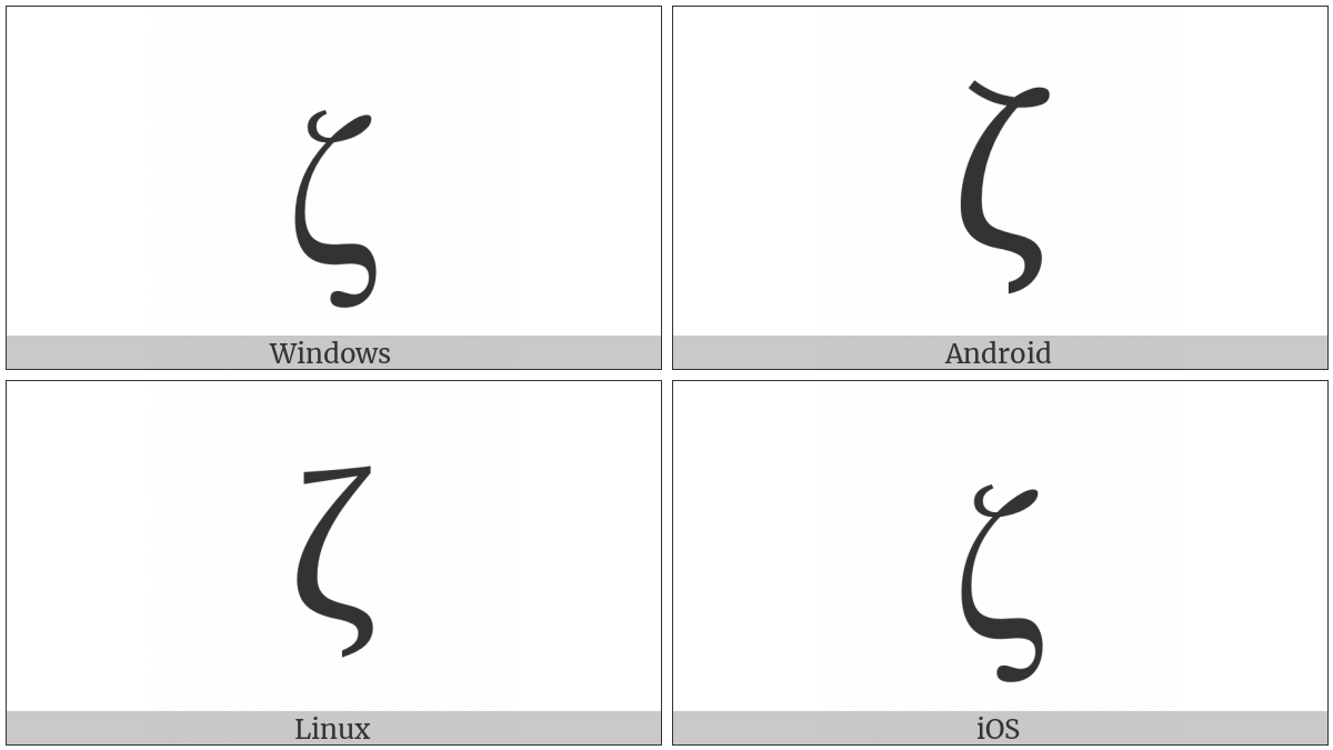 The image below shows how the “Greek Small Letter Zeta” symbol might look like on different operating systems. If the font in which this web site is displayed does not contain the symbol and there is no fallback font able to render it, you can use the image below to get an idea of what it should look like.