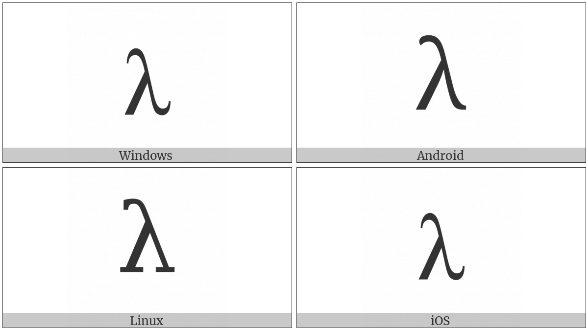 The image below shows how the “Greek Small Letter Lamda” symbol might look like on different operating systems. If the font in which this web site is displayed does not contain the symbol and there is no fallback font able to render it, you can use the image below to get an idea of what it should look like.