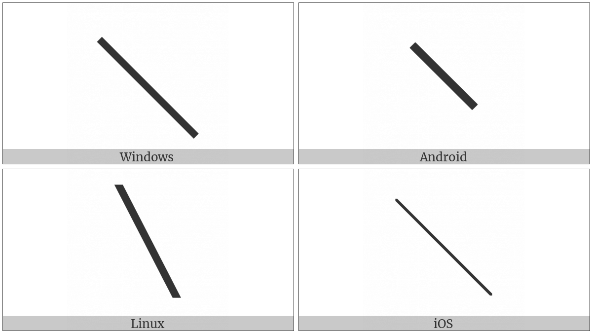 The image below shows how the “Box Drawings Light Diagonal Upper Left To Lower Right” symbol might look like on different operating systems. If the font in which this web site is displayed does not contain the symbol and there is no fallback font able to render it, you can use the image below to get an idea of what it should look like.