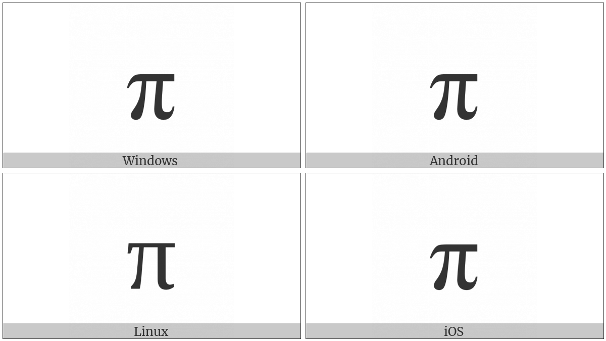 The image below shows how the “Greek Small Letter Pi” symbol might look like on different operating systems. If the font in which this web site is displayed does not contain the symbol and there is no fallback font able to render it, you can use the image below to get an idea of what it should look like.