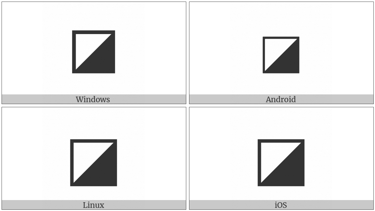 The image below shows how the “Square With Lower Right Diagonal Half Black” symbol might look like on different operating systems. If the font in which this web site is displayed does not contain the symbol and there is no fallback font able to render it, you can use the image below to get an idea of what it should look like.