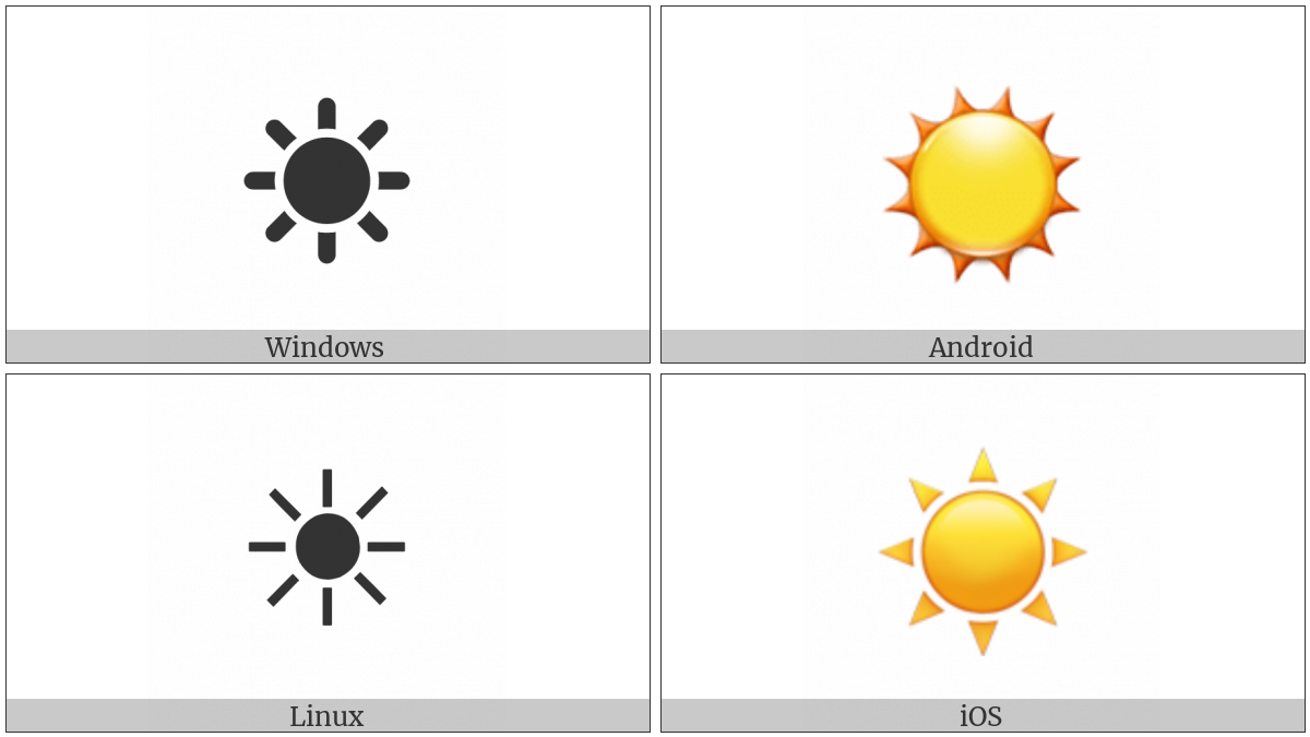 The image below shows how the “Black Sun With Rays” symbol might look like on different operating systems. If the font in which this web site is displayed does not contain the symbol and there is no fallback font able to render it, you can use the image below to get an idea of what it should look like.