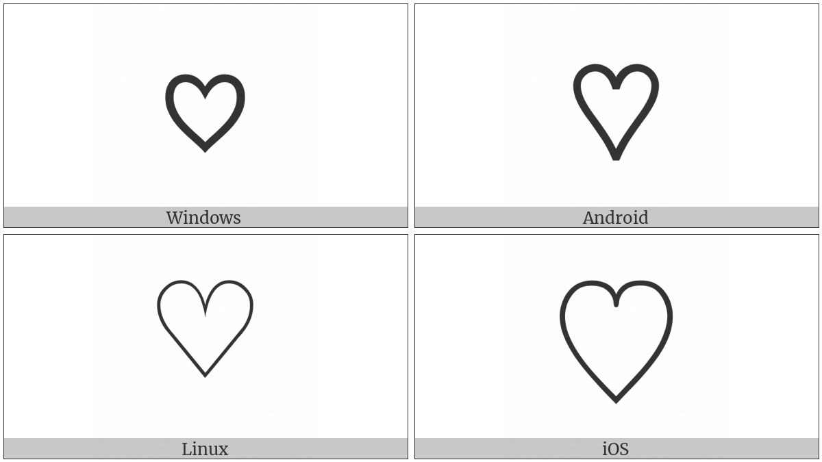 The image below shows how the “White Heart Suit” symbol might look like on different operating systems. If the font in which this web site is displayed does not contain the symbol and there is no fallback font able to render it, you can use the image below to get an idea of what it should look like.