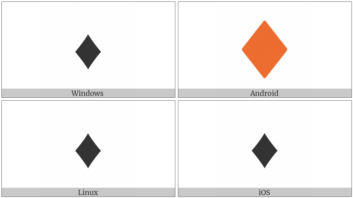 The image below shows how the “Black Diamond Suit” symbol might look like on different operating systems. If the font in which this web site is displayed does not contain the symbol and there is no fallback font able to render it, you can use the image below to get an idea of what it should look like.