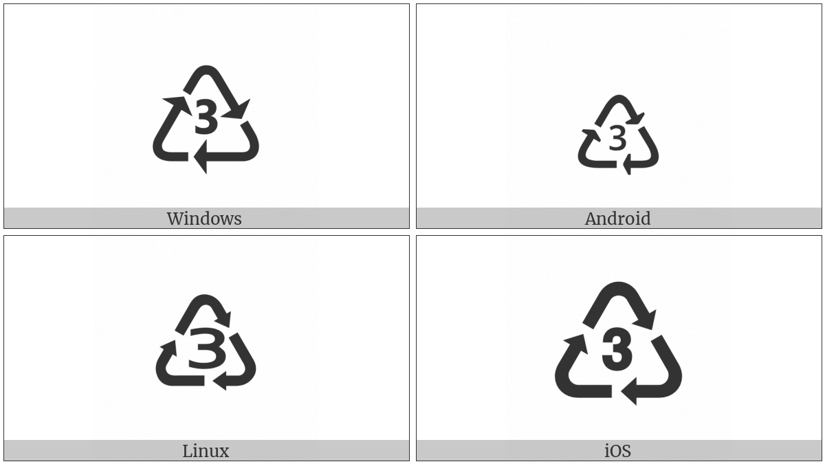 The image below shows how the “Recycling Symbol For Type-3 Plastics” symbol might look like on different operating systems. If the font in which this web site is displayed does not contain the symbol and there is no fallback font able to render it, you can use the image below to get an idea of what it should look like.