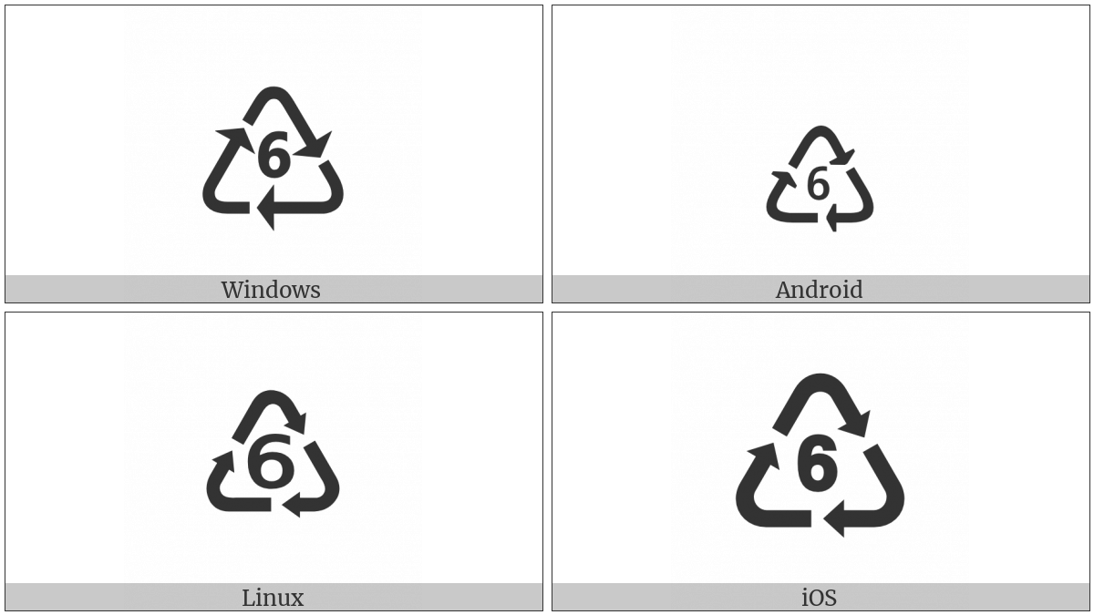 The image below shows how the “Recycling Symbol For Type-6 Plastics” symbol might look like on different operating systems. If the font in which this web site is displayed does not contain the symbol and there is no fallback font able to render it, you can use the image below to get an idea of what it should look like.