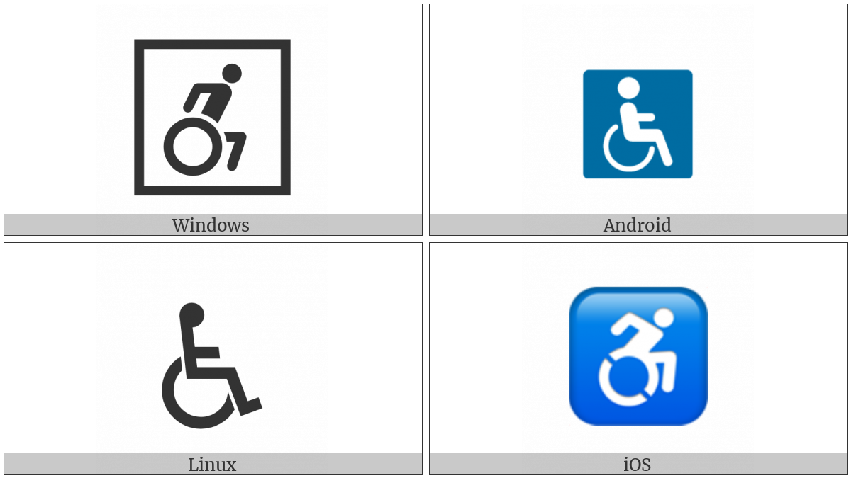 The image below shows how the “Wheelchair Symbol” symbol might look like on different operating systems. If the font in which this web site is displayed does not contain the symbol and there is no fallback font able to render it, you can use the image below to get an idea of what it should look like.