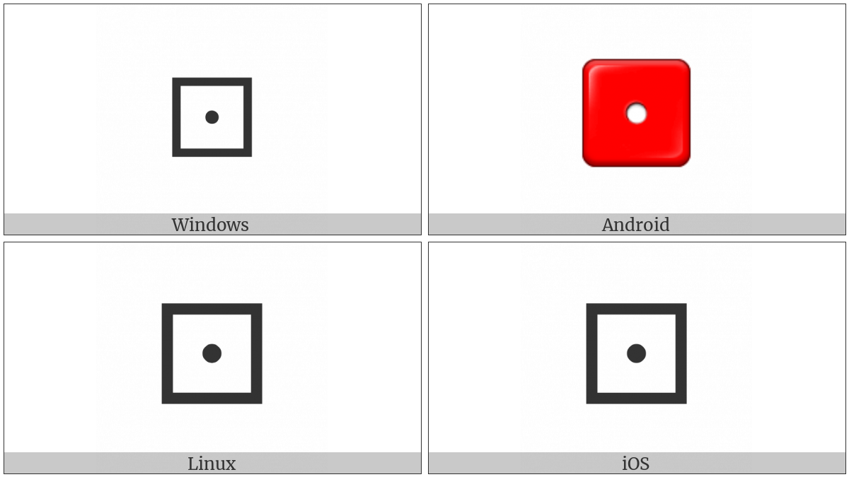 The image below shows how the “Die Face-1” symbol might look like on different operating systems. If the font in which this web site is displayed does not contain the symbol and there is no fallback font able to render it, you can use the image below to get an idea of what it should look like.