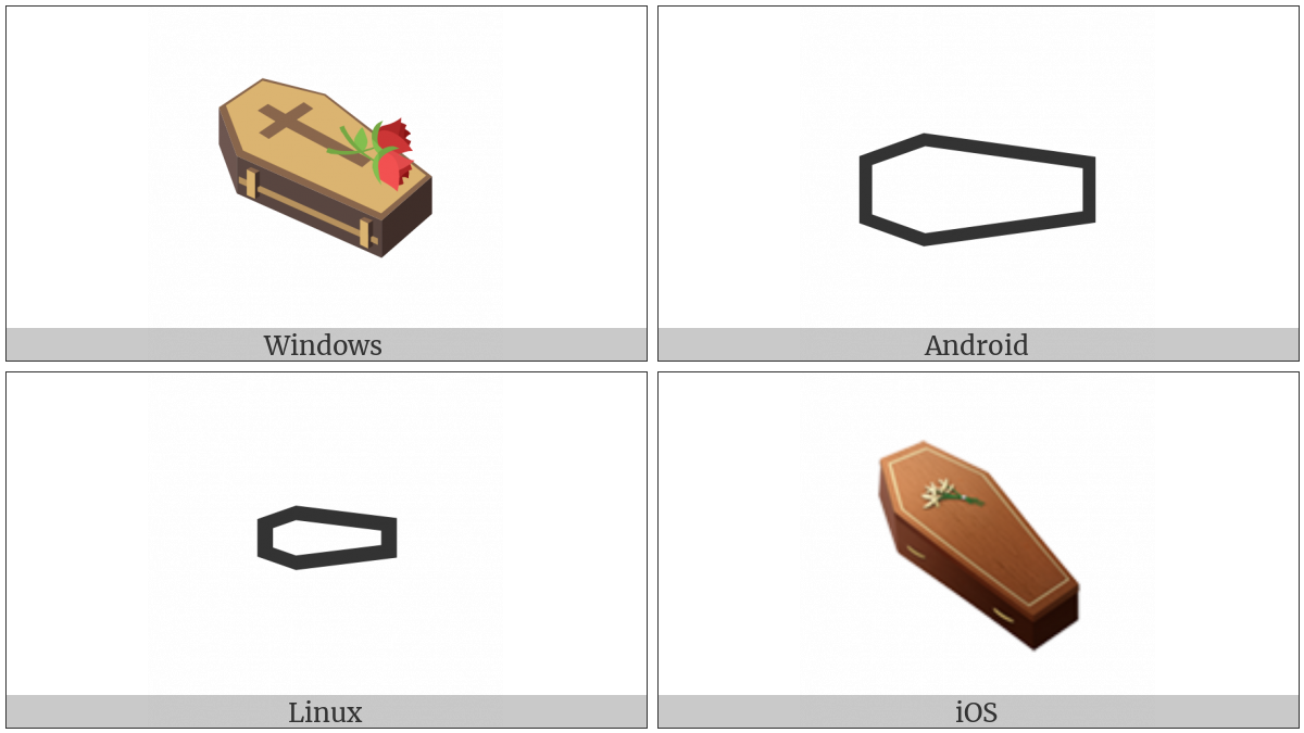 The image below shows how the “Coffin” symbol might look like on different operating systems. If the font in which this web site is displayed does not contain the symbol and there is no fallback font able to render it, you can use the image below to get an idea of what it should look like.