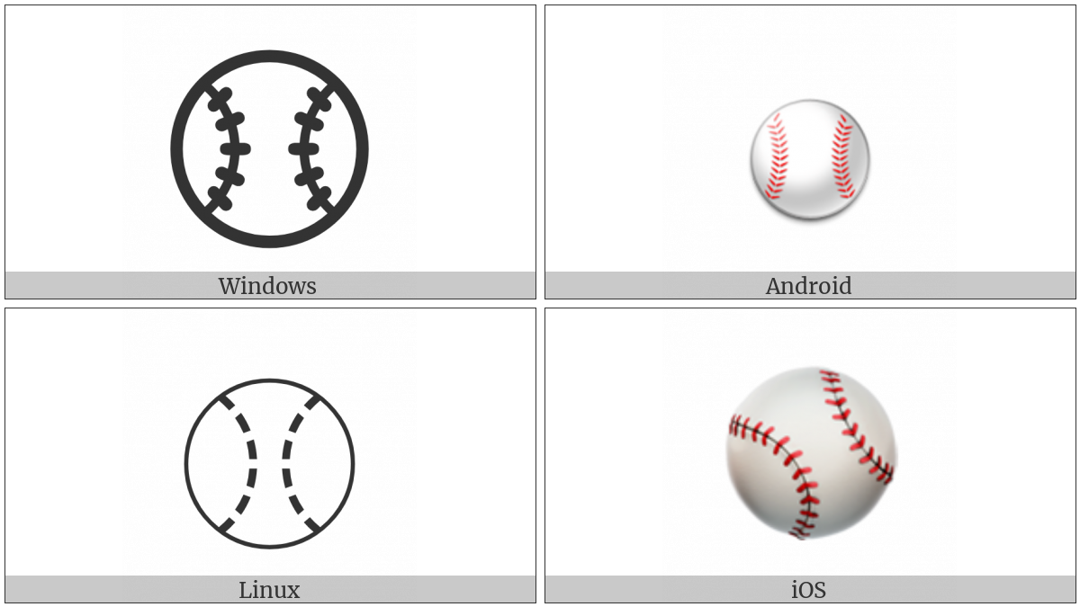 The image below shows how the “Baseball” symbol might look like on different operating systems. If the font in which this web site is displayed does not contain the symbol and there is no fallback font able to render it, you can use the image below to get an idea of what it should look like.