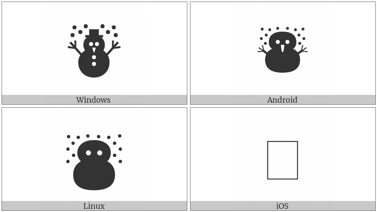 The image below shows how the “Black Snowman” symbol might look like on different operating systems. If the font in which this web site is displayed does not contain the symbol and there is no fallback font able to render it, you can use the image below to get an idea of what it should look like.