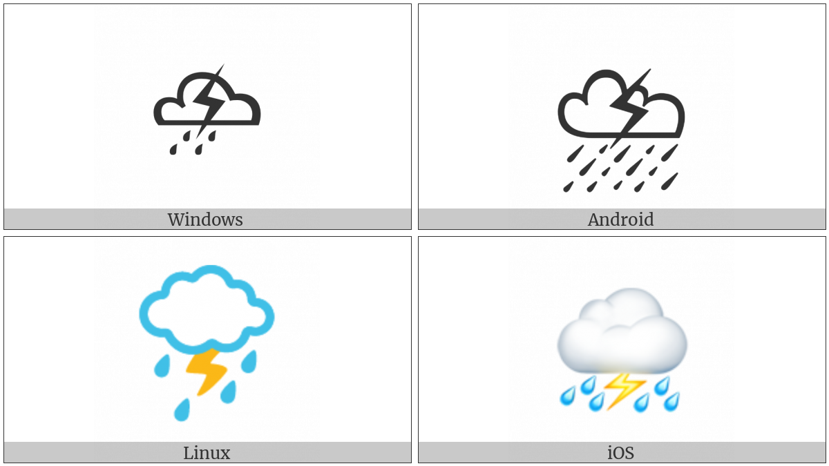 The image below shows how the “Thunder Cloud And Rain” symbol might look like on different operating systems. If the font in which this web site is displayed does not contain the symbol and there is no fallback font able to render it, you can use the image below to get an idea of what it should look like.