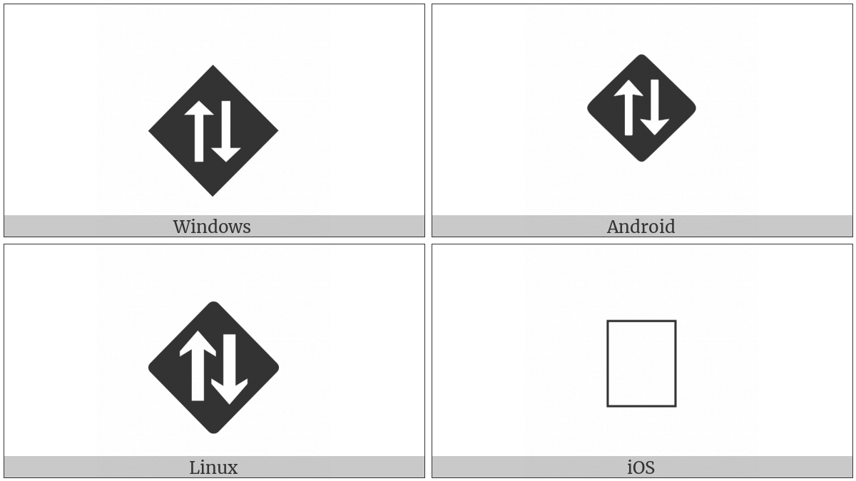 The image below shows how the “Black Two-Way Left Way Traffic” symbol might look like on different operating systems. If the font in which this web site is displayed does not contain the symbol and there is no fallback font able to render it, you can use the image below to get an idea of what it should look like.