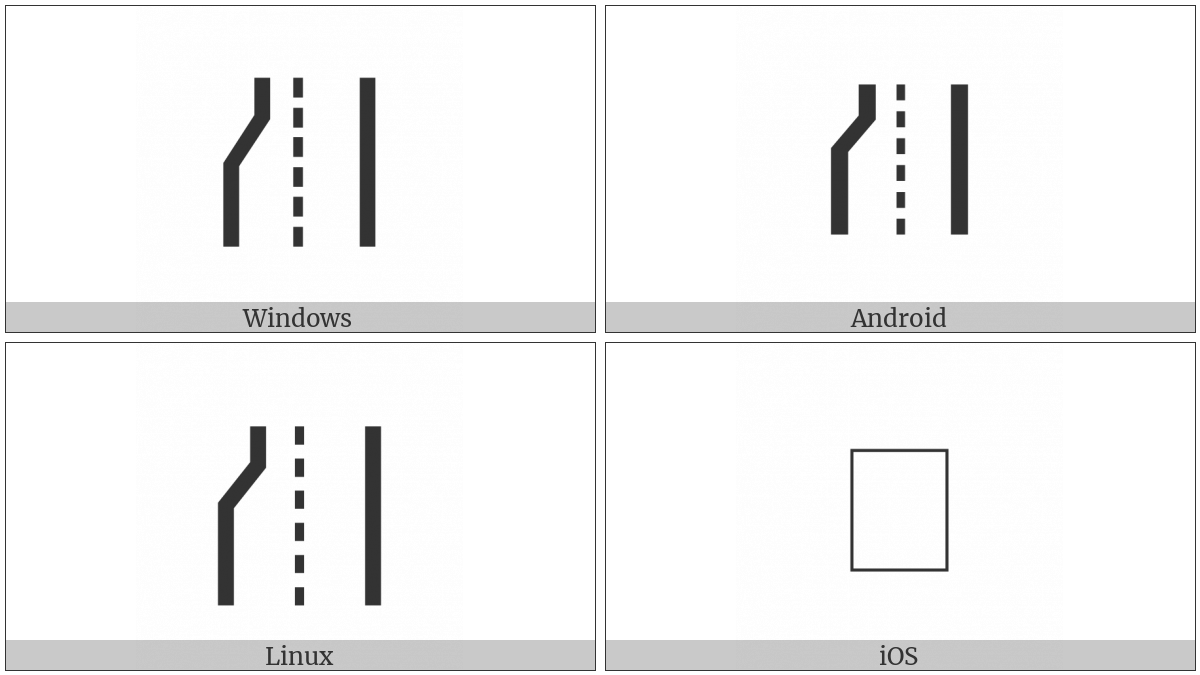 The image below shows how the “White Left Lane Merge” symbol might look like on different operating systems. If the font in which this web site is displayed does not contain the symbol and there is no fallback font able to render it, you can use the image below to get an idea of what it should look like.