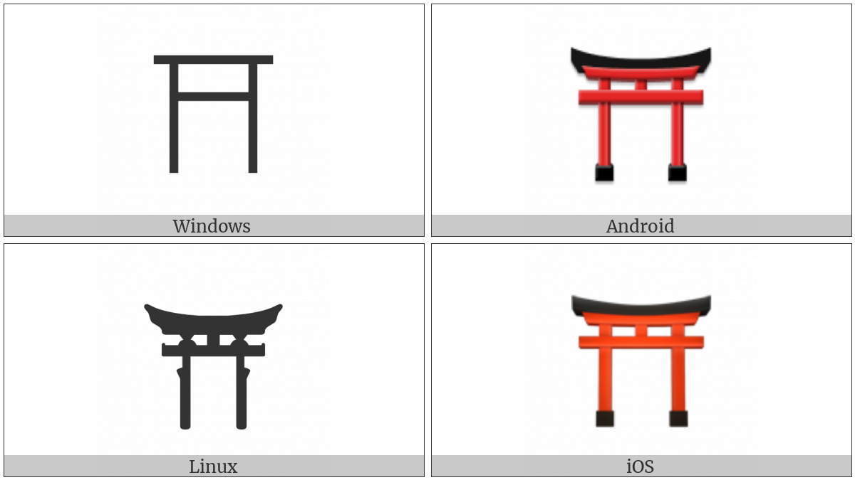 The image below shows how the “Shinto Shrine” symbol might look like on different operating systems. If the font in which this web site is displayed does not contain the symbol and there is no fallback font able to render it, you can use the image below to get an idea of what it should look like.