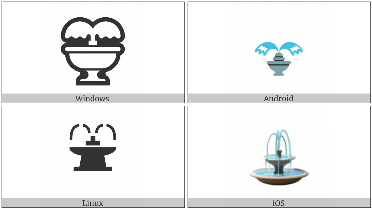 The image below shows how the “Fountain” symbol might look like on different operating systems. If the font in which this web site is displayed does not contain the symbol and there is no fallback font able to render it, you can use the image below to get an idea of what it should look like.