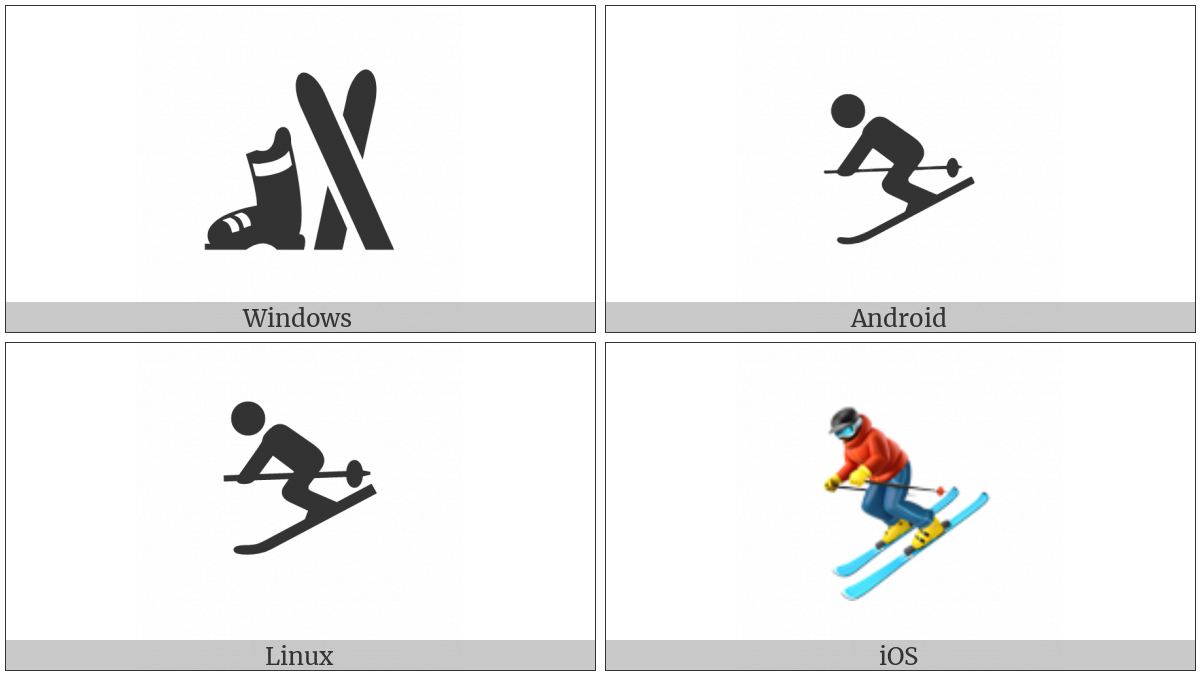The image below shows how the “Skier” symbol might look like on different operating systems. If the font in which this web site is displayed does not contain the symbol and there is no fallback font able to render it, you can use the image below to get an idea of what it should look like.